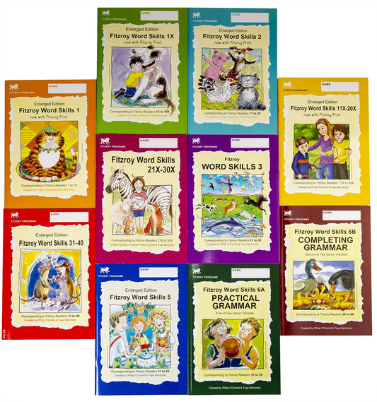 The Fitzroy Program is a complete P-6 literacy resource. Nine sets of ten sequential phonic readers form the core of the program. The Word Skills workbooks provide activities that focus on each new sound or digraph introduced in the readers, as well as spelling, grammar, comprehension and creative English exercises. There is one Word Skills workbook for each set of readers, except the final set which has two workbooks. Unique worksheets accompany each reader.